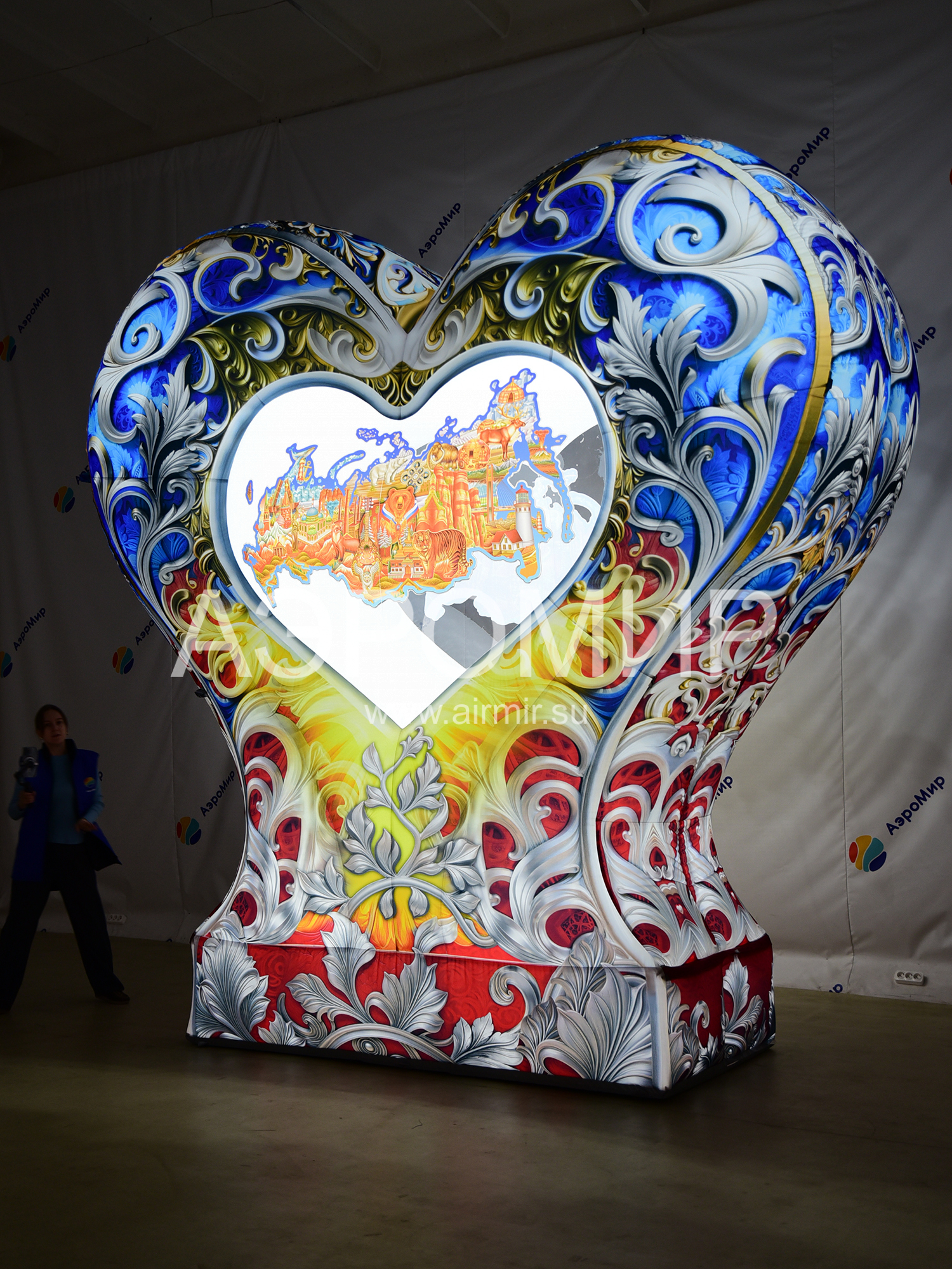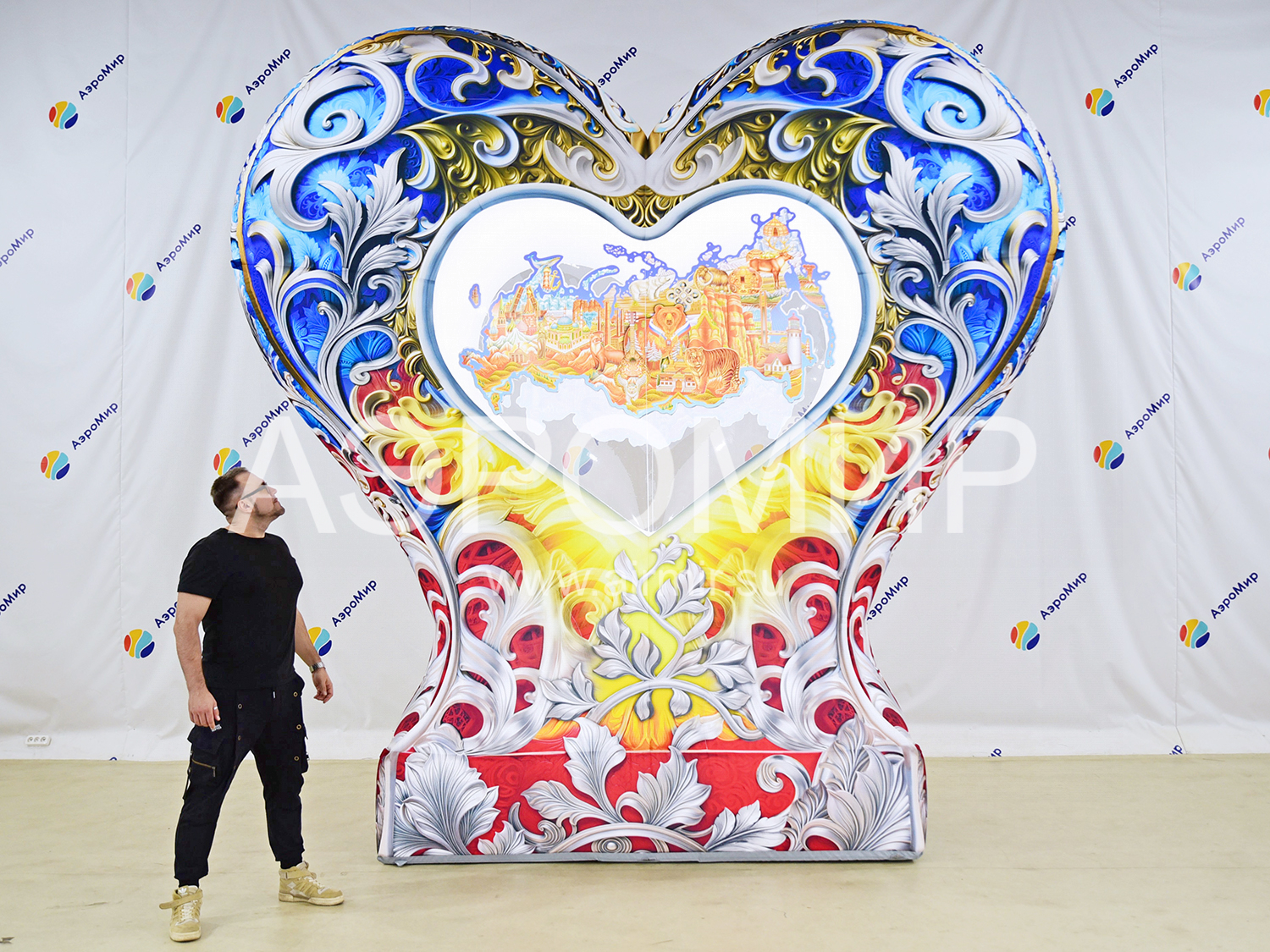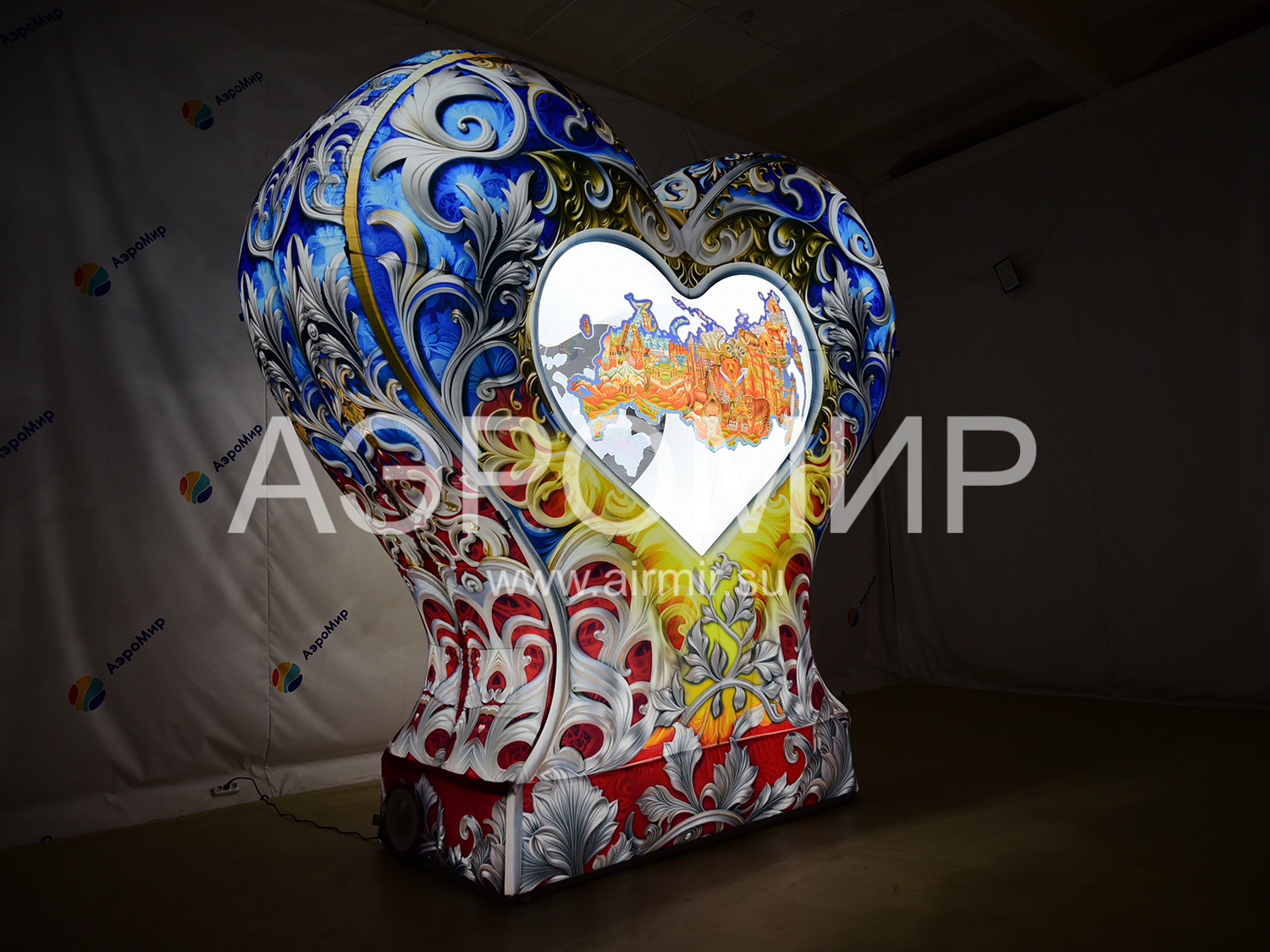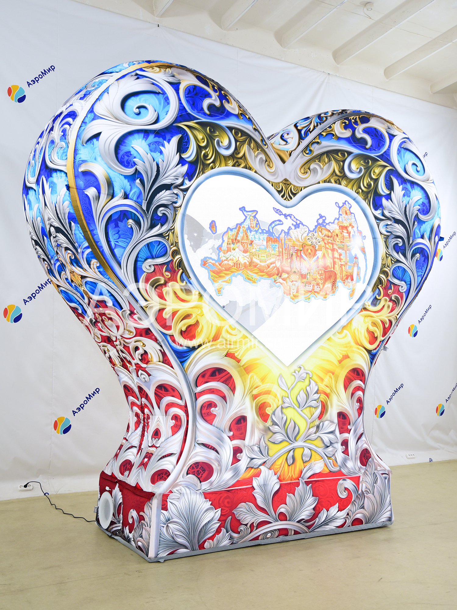 Надувное сердце на опоре с подсветкой – эффектная декорация для фотозон. В центре – стилизованная карта России. "АэроМир" предлагает индивидуальный дизайн и фотопечать. Идеально для мероприятий, городских инсталляций, рекламы, свадеб и праздников. Преимущества: привлекательный вид, простота установки, полная комплектация и удобная транспортировка.