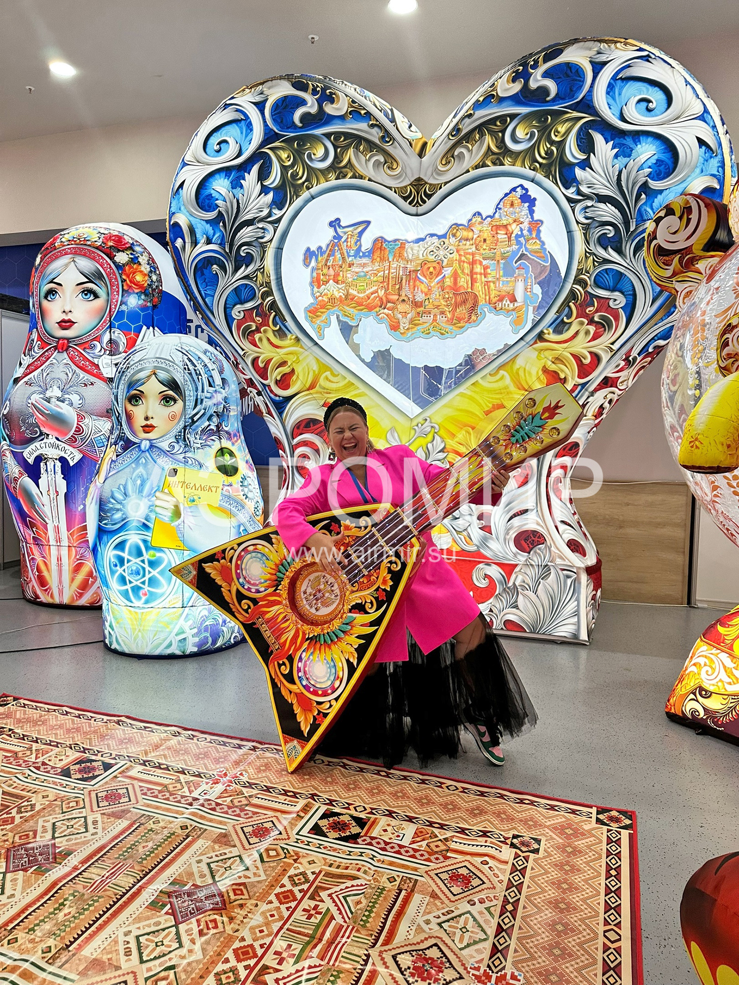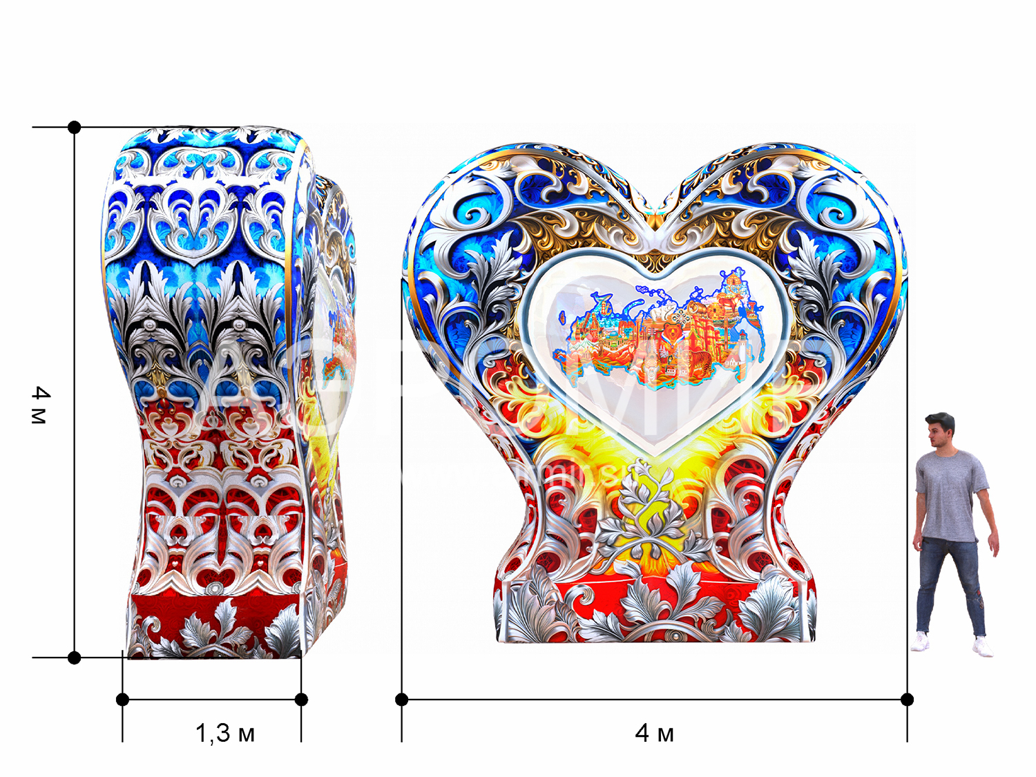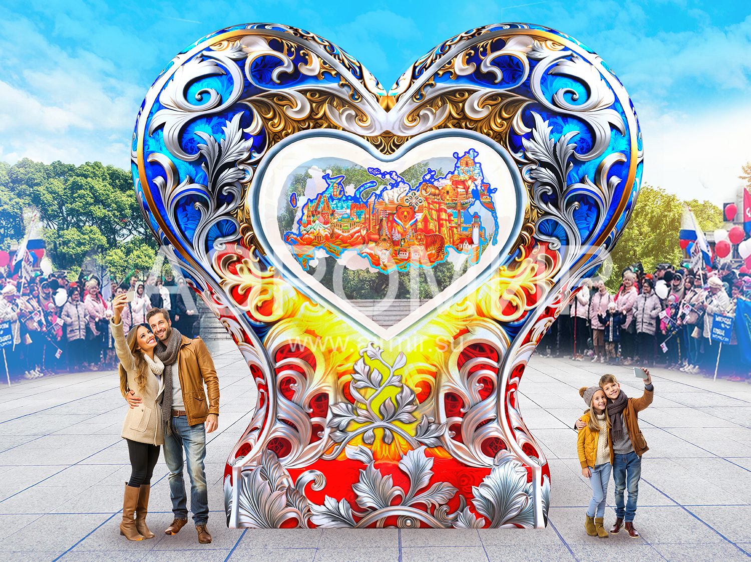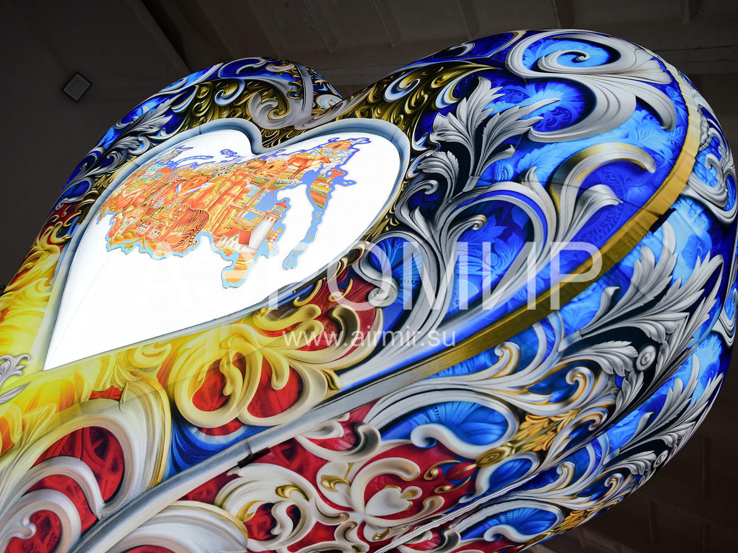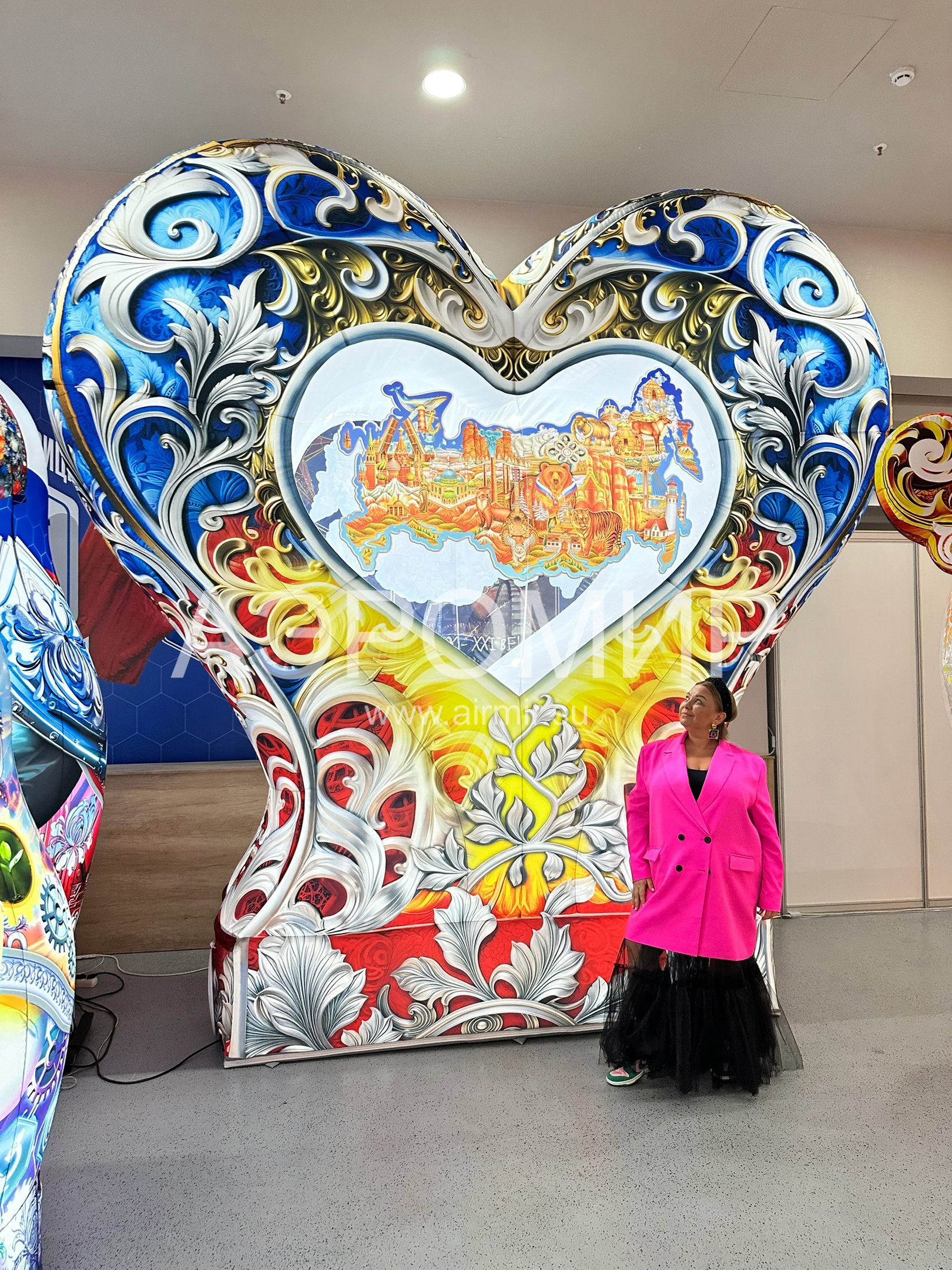 Надувное сердце на опоре с подсветкой – эффектная декорация для фотозон. В центре – стилизованная карта России. "АэроМир" предлагает индивидуальный дизайн и фотопечать. Идеально для мероприятий, городских инсталляций, рекламы, свадеб и праздников. Преимущества: привлекательный вид, простота установки, полная комплектация и удобная транспортировка.