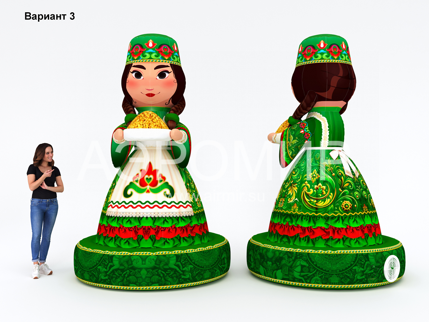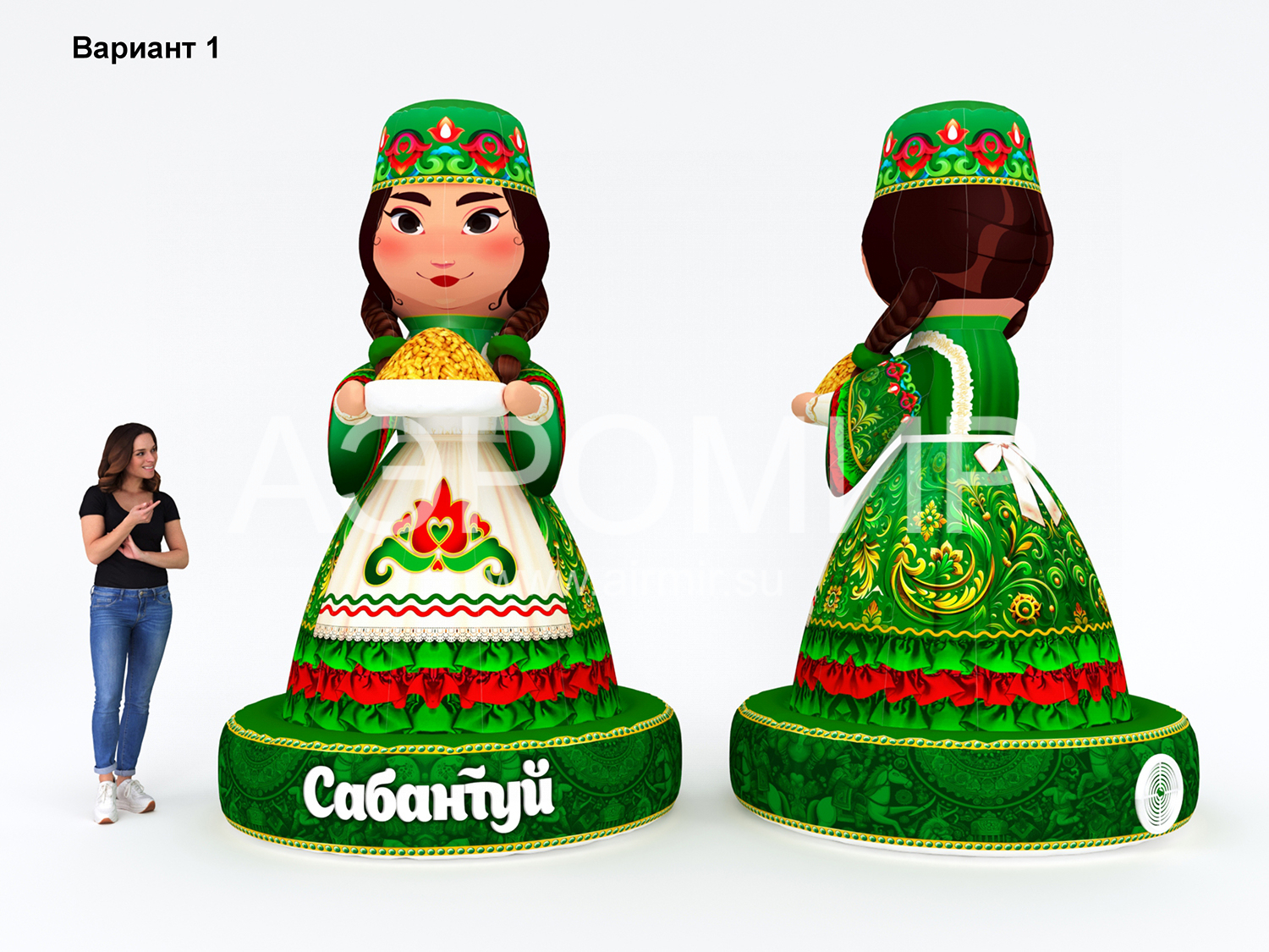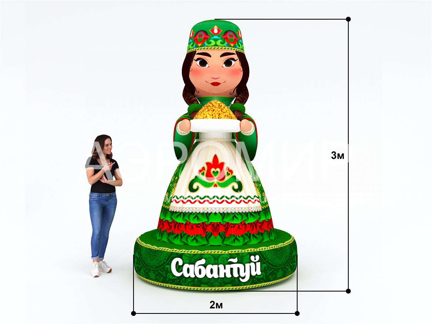 Ищете яркое и запоминающееся украшение для Сабантуя? Представляем «Хозяйку Сабантуя» – трехметровую фигуру из ткани Оксфорд с полноцветной печатью. Благодаря возможности установки подсветки, она будет эффектно выглядеть как днем, так и ночью. Эта универсальная фигура может использоваться для различных целей: от приветствия гостей и оформления входной зоны до создания центрального элемента сцены, фотозоны или тематической инсталляции.