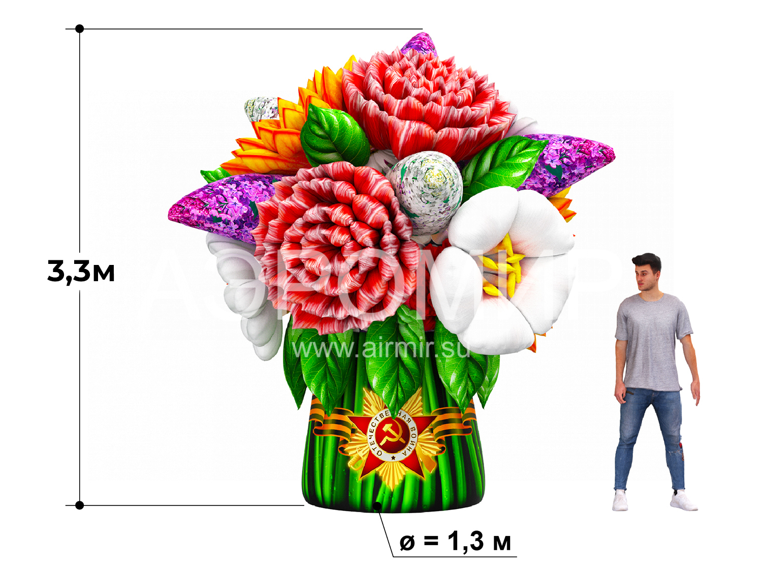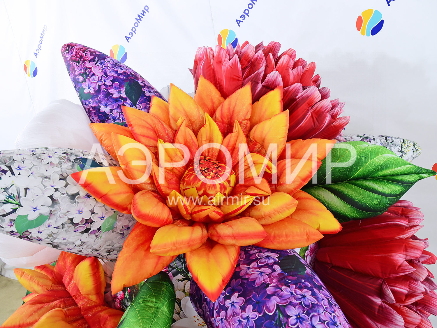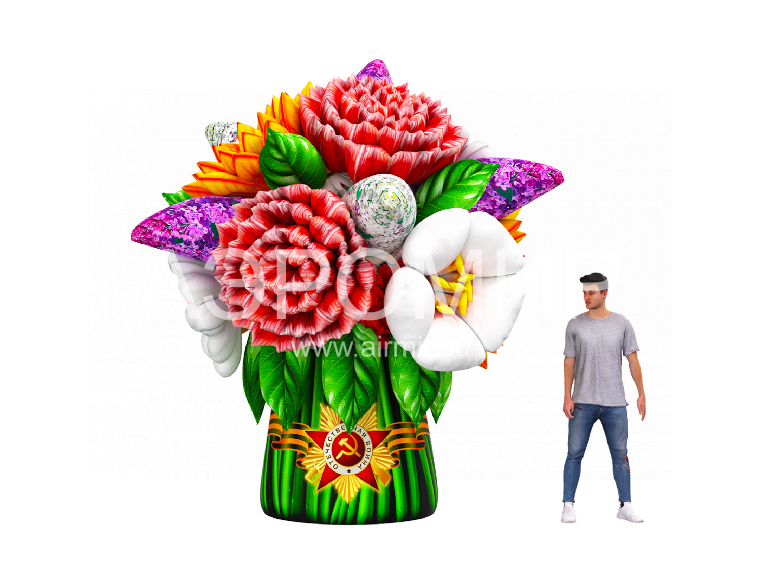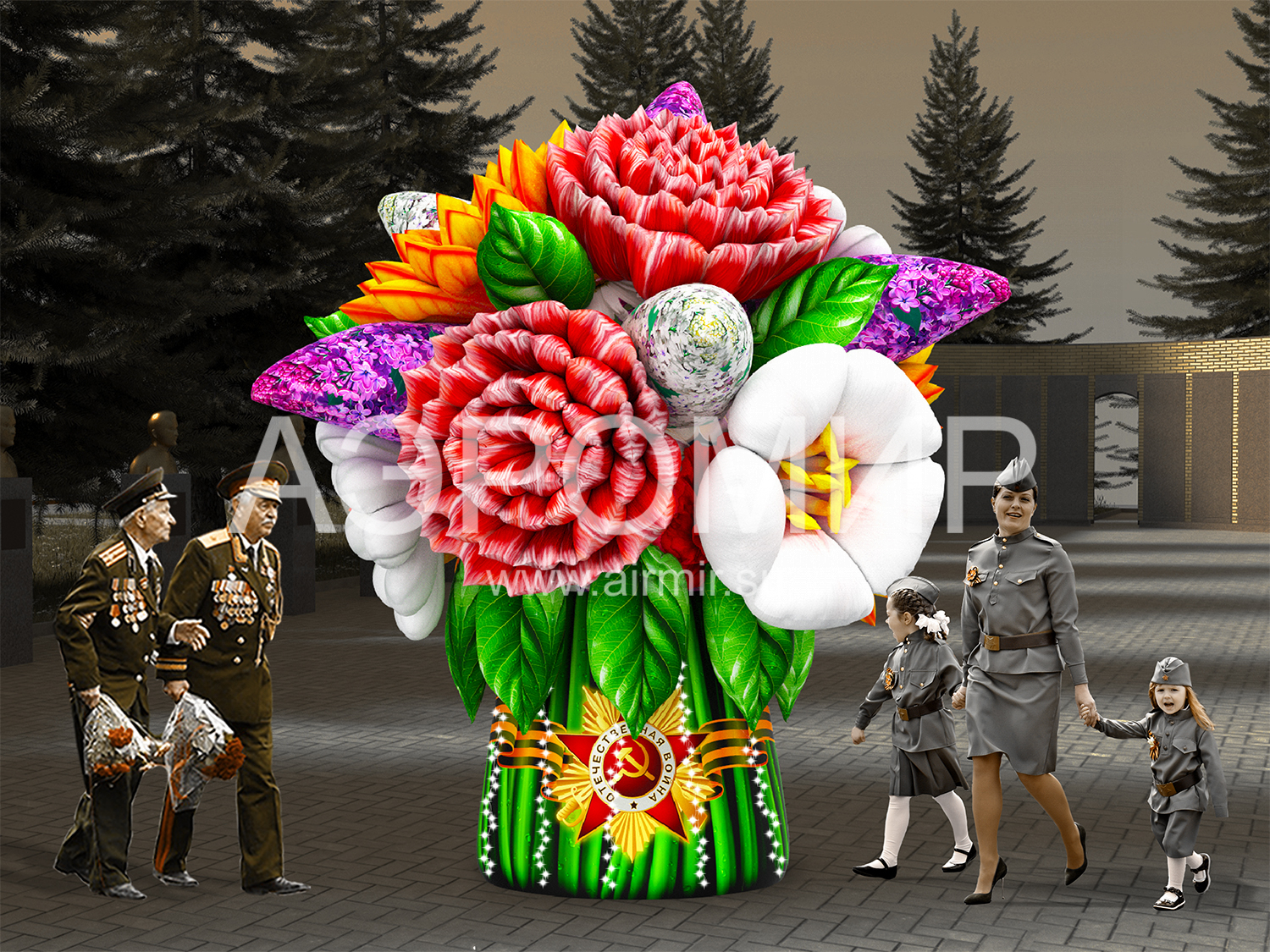 Современные мероприятия все чаще украшают большими надувными букетами цветов, создающими праздничную атмосферу. Предлагаем букет с яблоней, георгинами, гвоздиками и сиренью. Ко Дню Победы добавим георгиевскую ленту. Возможна подсветка.