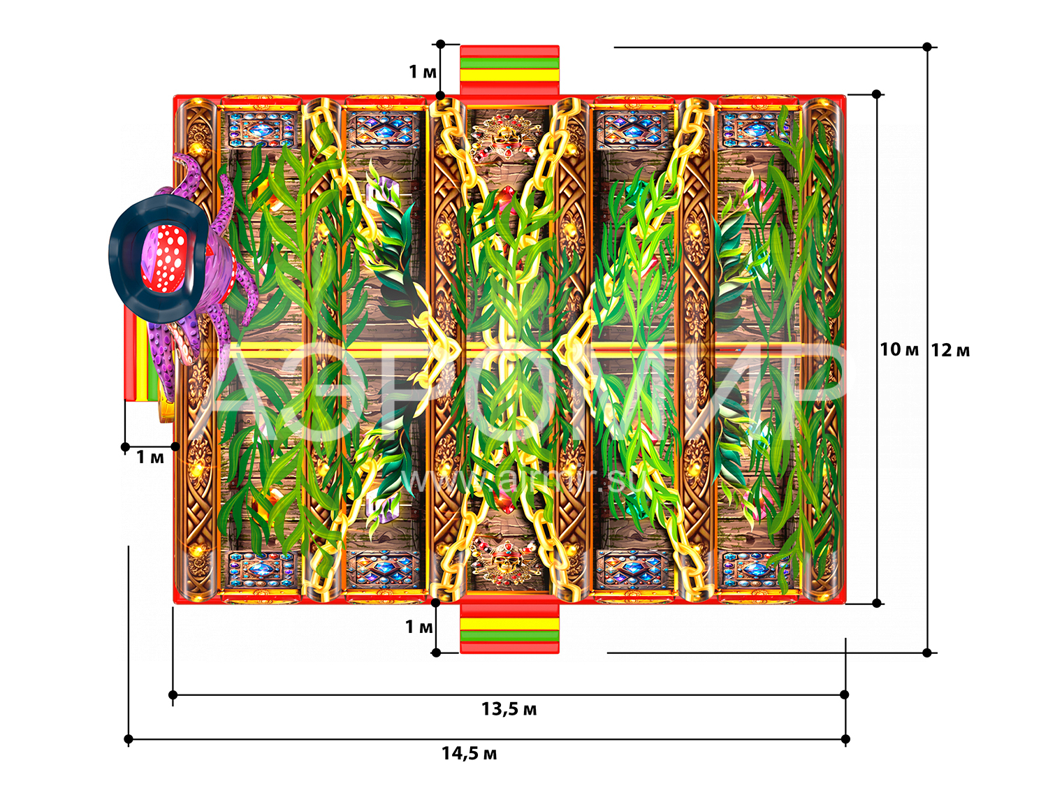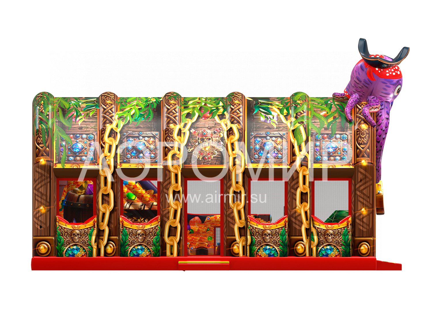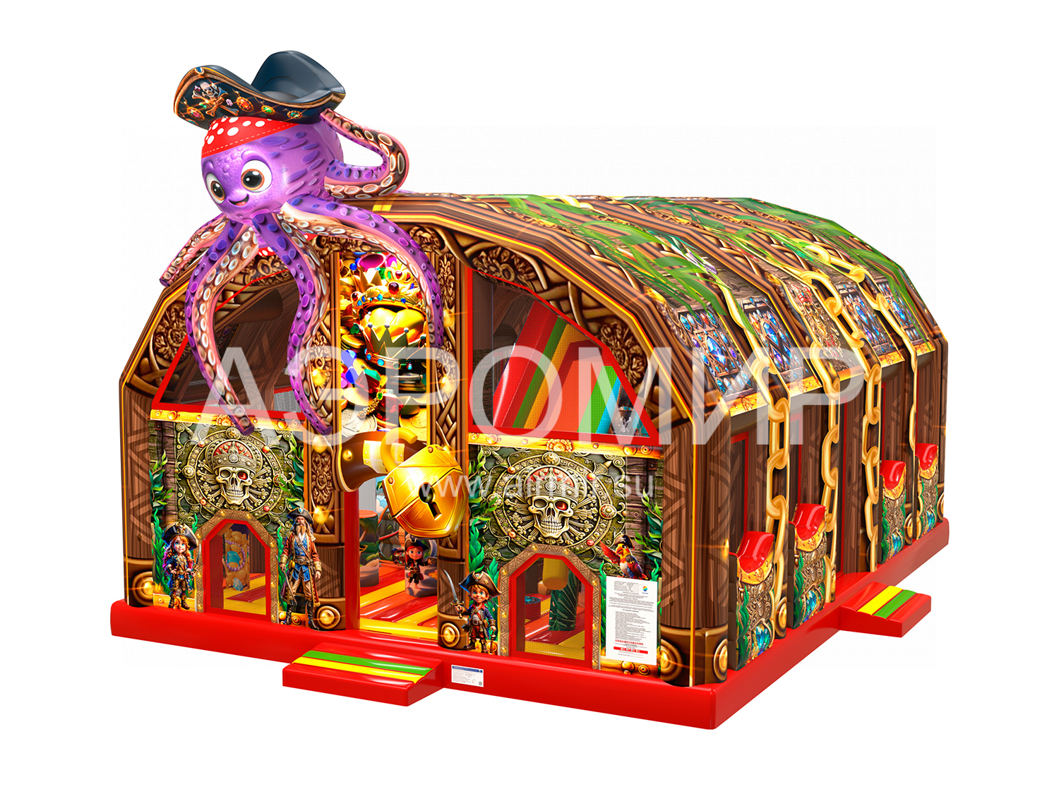 "Пиратский сундук" – яркий батут с крышей в виде сундука сокровищ, подходящий для детей всех возрастов. Внутри: горка (3,8 м), прыжковая зона с тематическими элементами (мягкая яма, столбики, бочка, штурвал, сокровища, пушка, пальмы, пираты). На крыше – надувной осьминог-пират. Водоотталкивающий навес продлевает сезон, а сетки обеспечивают вентиляцию и обзор. Гарантия 1 год. Доставка по России и СНГ.