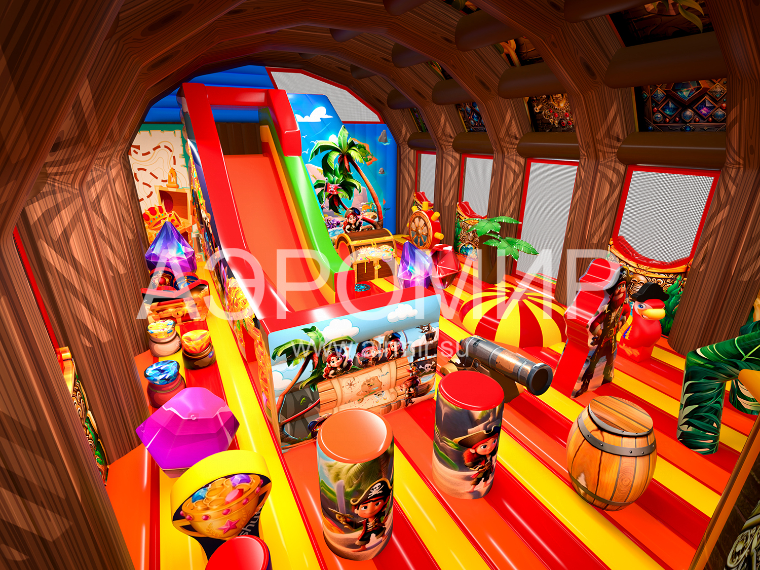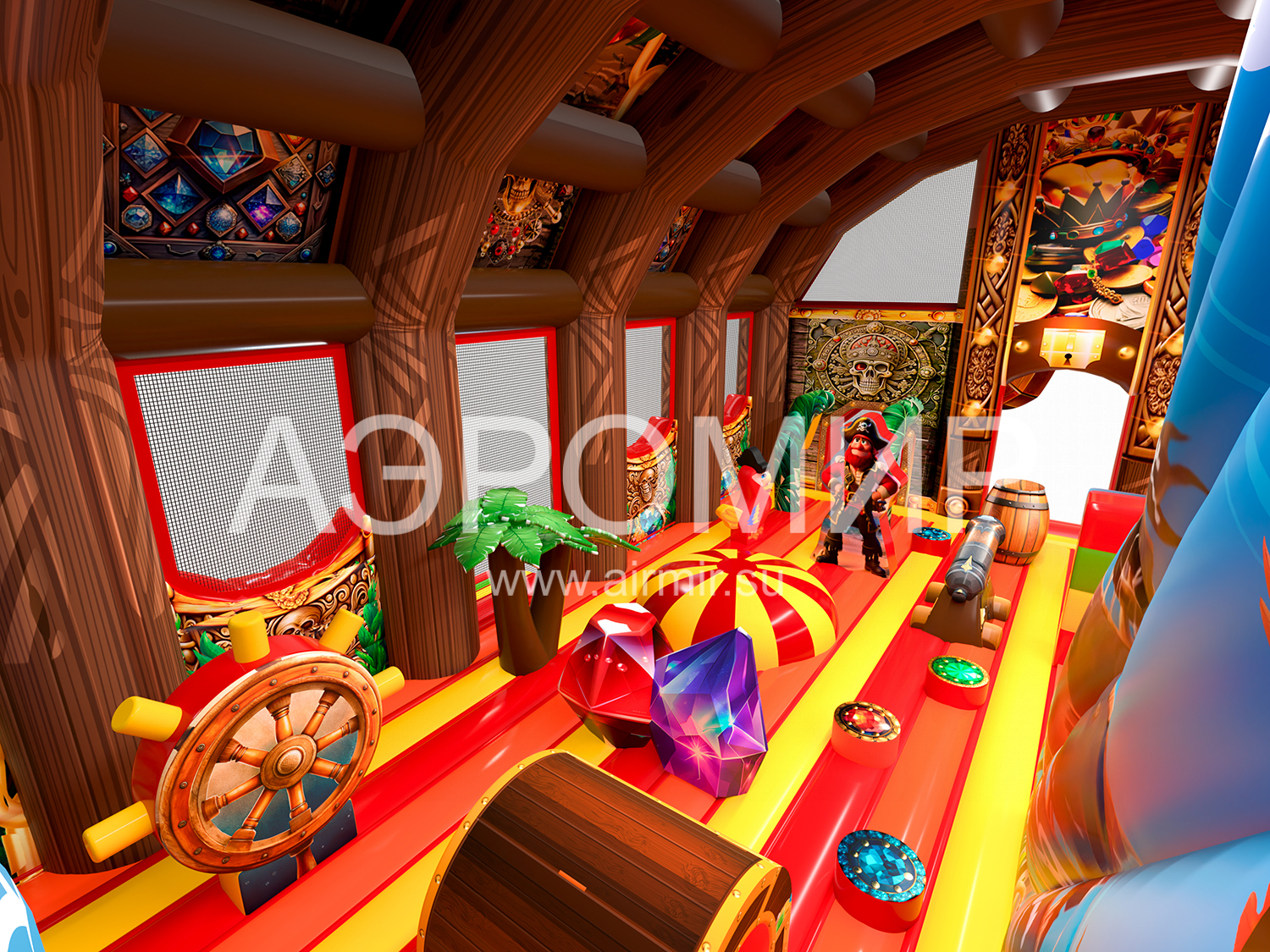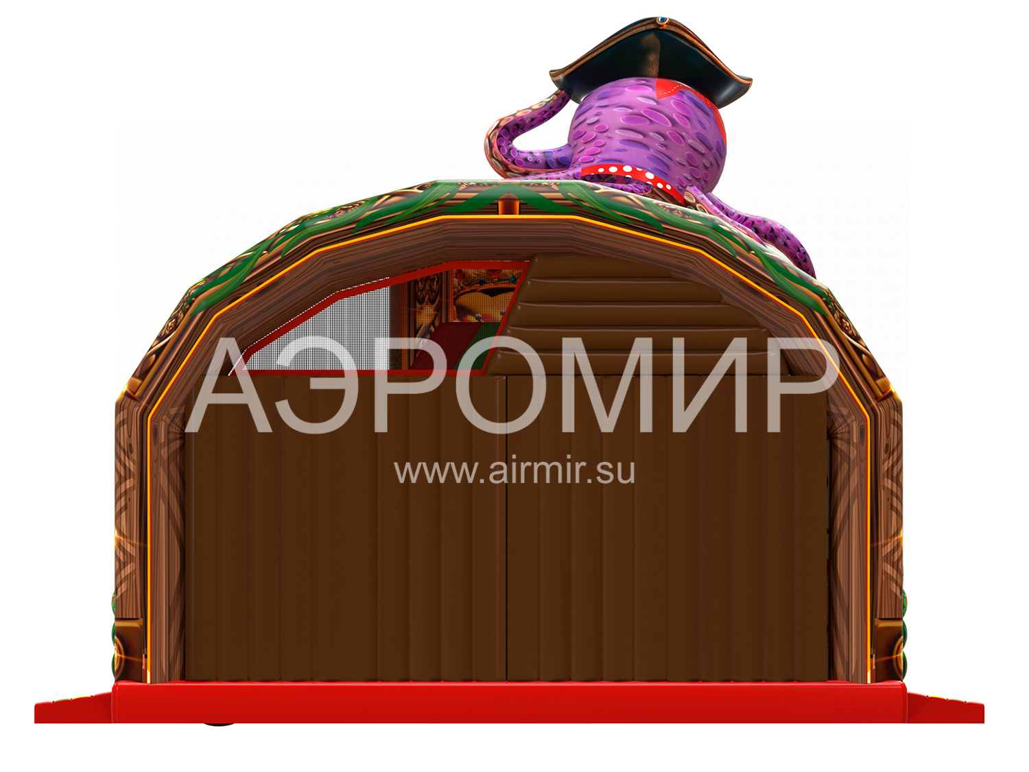 "Пиратский сундук" – яркий батут с крышей в виде сундука сокровищ, подходящий для детей всех возрастов. Внутри: горка (3,8 м), прыжковая зона с тематическими элементами (мягкая яма, столбики, бочка, штурвал, сокровища, пушка, пальмы, пираты). На крыше – надувной осьминог-пират. Водоотталкивающий навес продлевает сезон, а сетки обеспечивают вентиляцию и обзор. Гарантия 1 год. Доставка по России и СНГ.