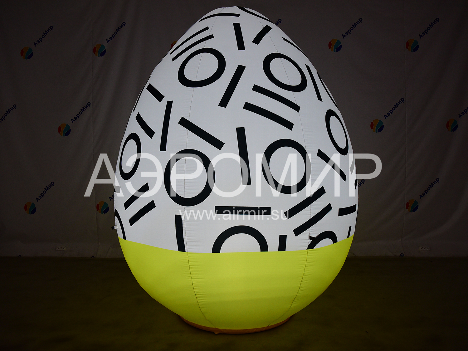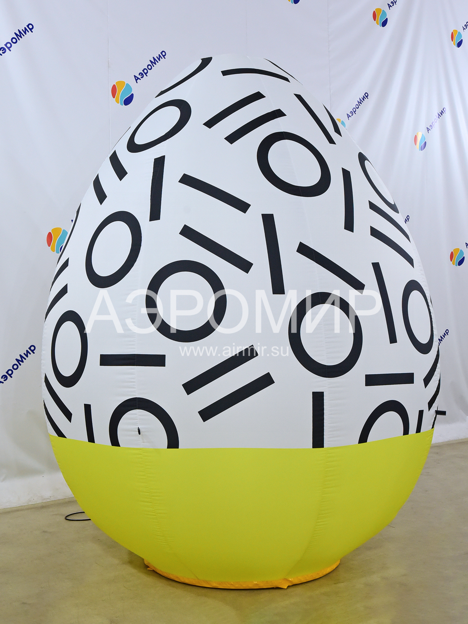 A large advertising figure - a ball in the form of an egg. Unusual original form - draws additional attention to your brand. This is an art object and advertising figure at the same time. Illumination can be built into it and this will make the figure noticeable even in the dark time of day. The final design, colors and details are discussed with the managers when placing the order. The material is oxford 300-600 D. The height of the product can be from 1-3 meters. Short production times, low producer prices and delivery throughout Russia, Europe and the CIS countries are the advantages of inflatable products from the AeroMir manufacturing company.