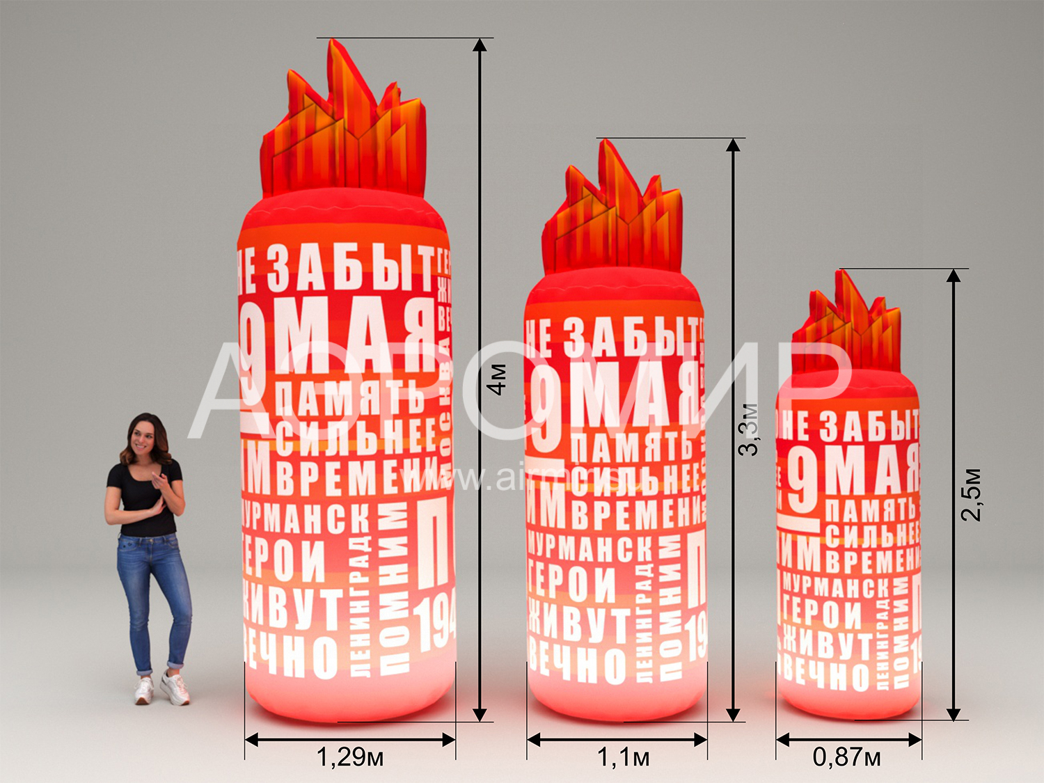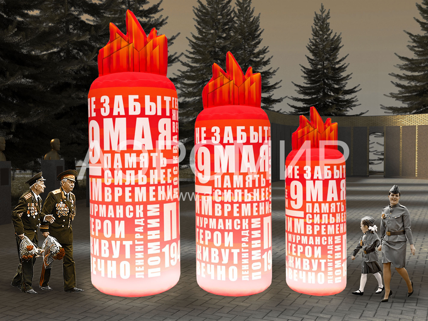 "Свеча памяти" – это впечатляющая надувная колонна в виде свечи, созданная специально ко Дню Победы. Благодаря встроенной подсветке, она станет ярким акцентом на площадях, в местах проведения праздничных мероприятий 9 мая, а также послужит оригинальным элементом декора сцены или фотозоны. На колонну нанесена качественная полноцветная фотопечать и вдохновляющие памятные надписи. В темное время суток подсветка создает особую, торжественную атмосферу. Мы предлагаем три размера на выбор, чтобы вы могли подобрать идеальную "Свечу памяти" для вашего мероприятия.