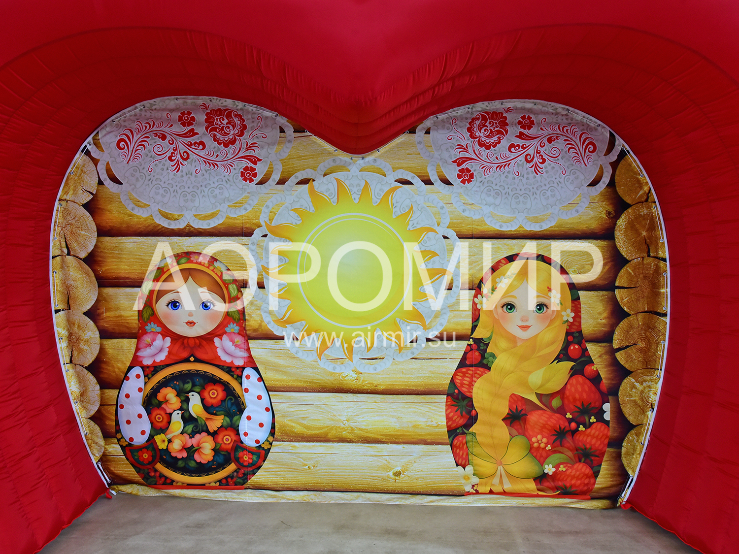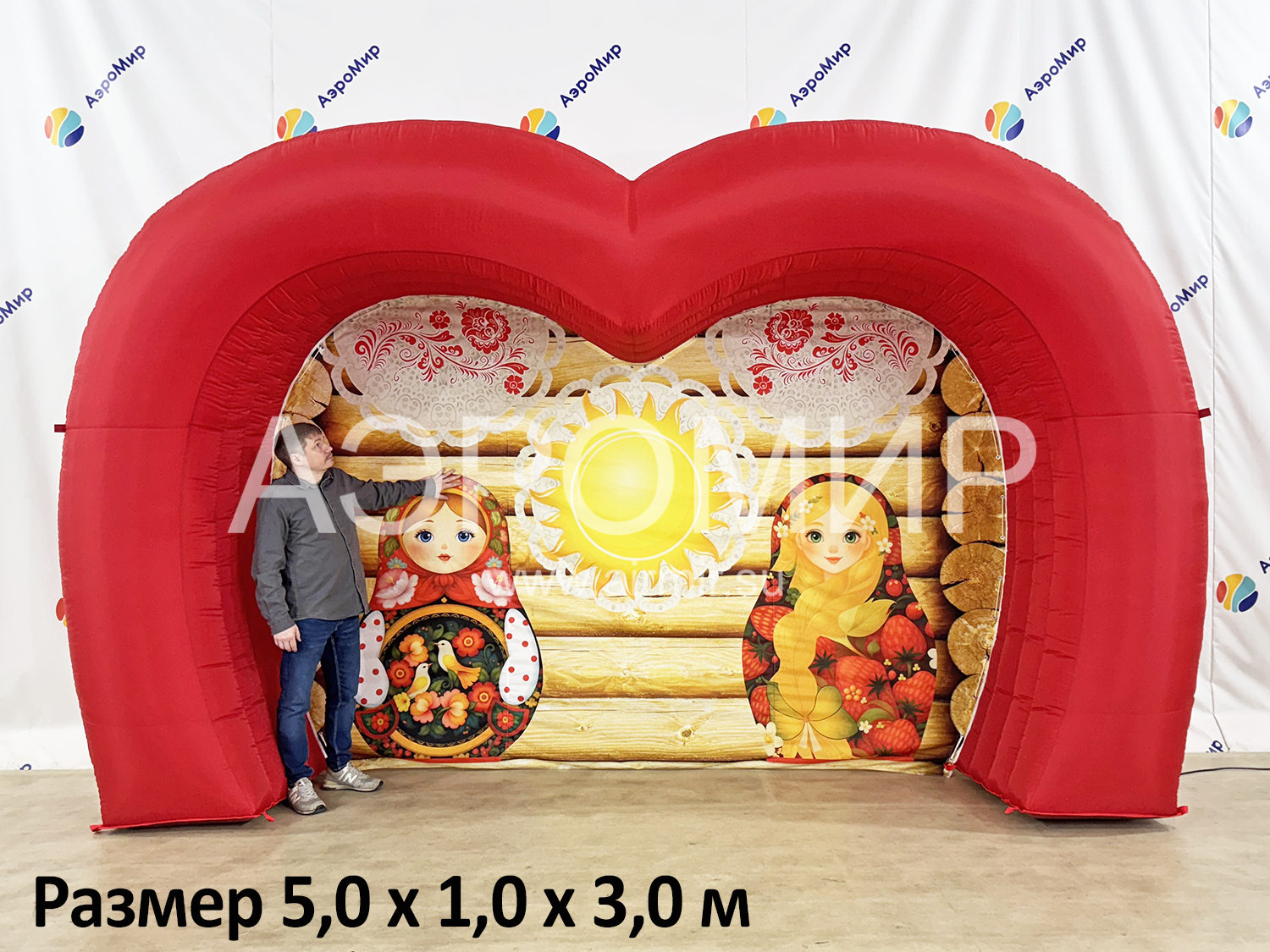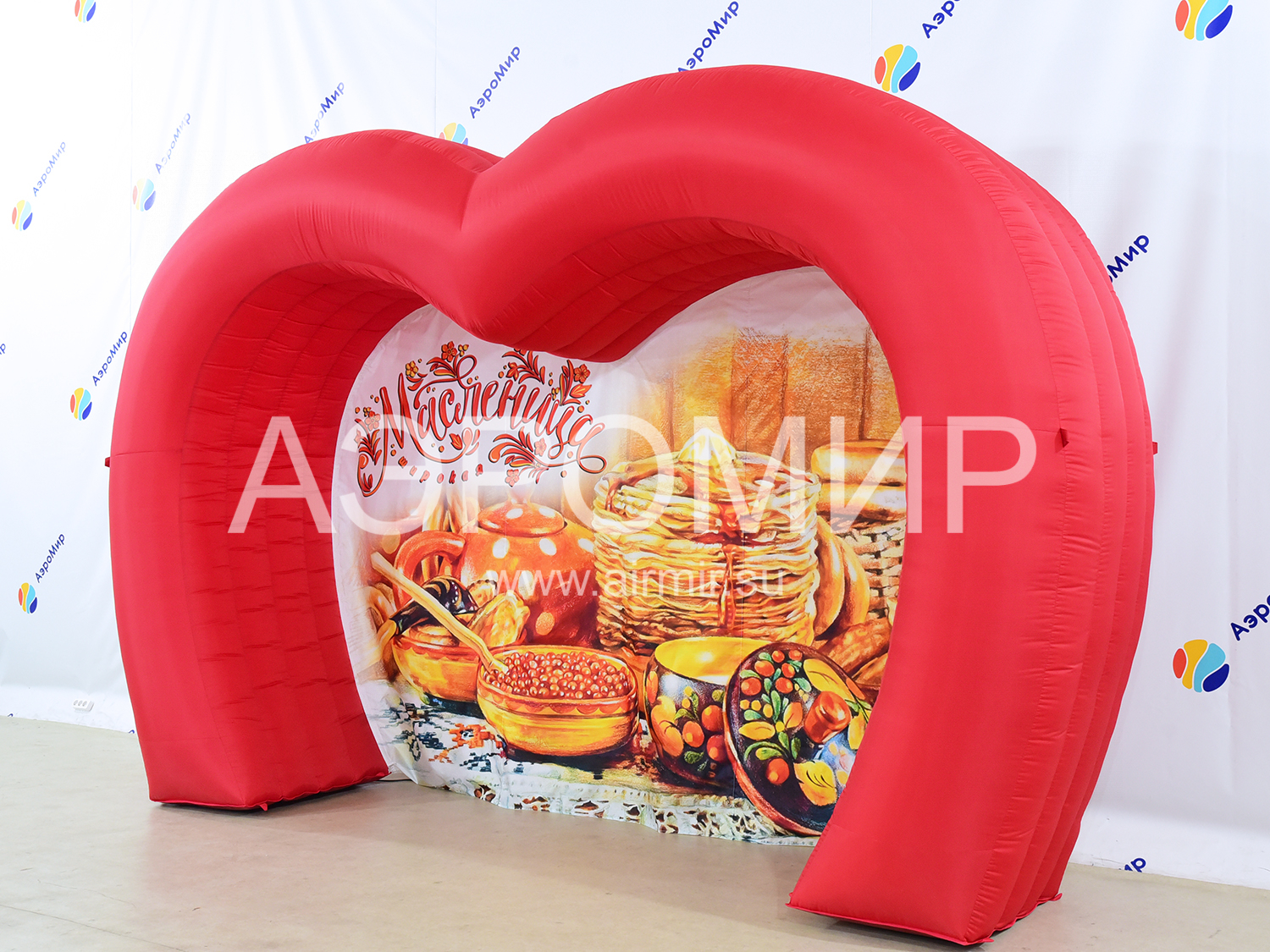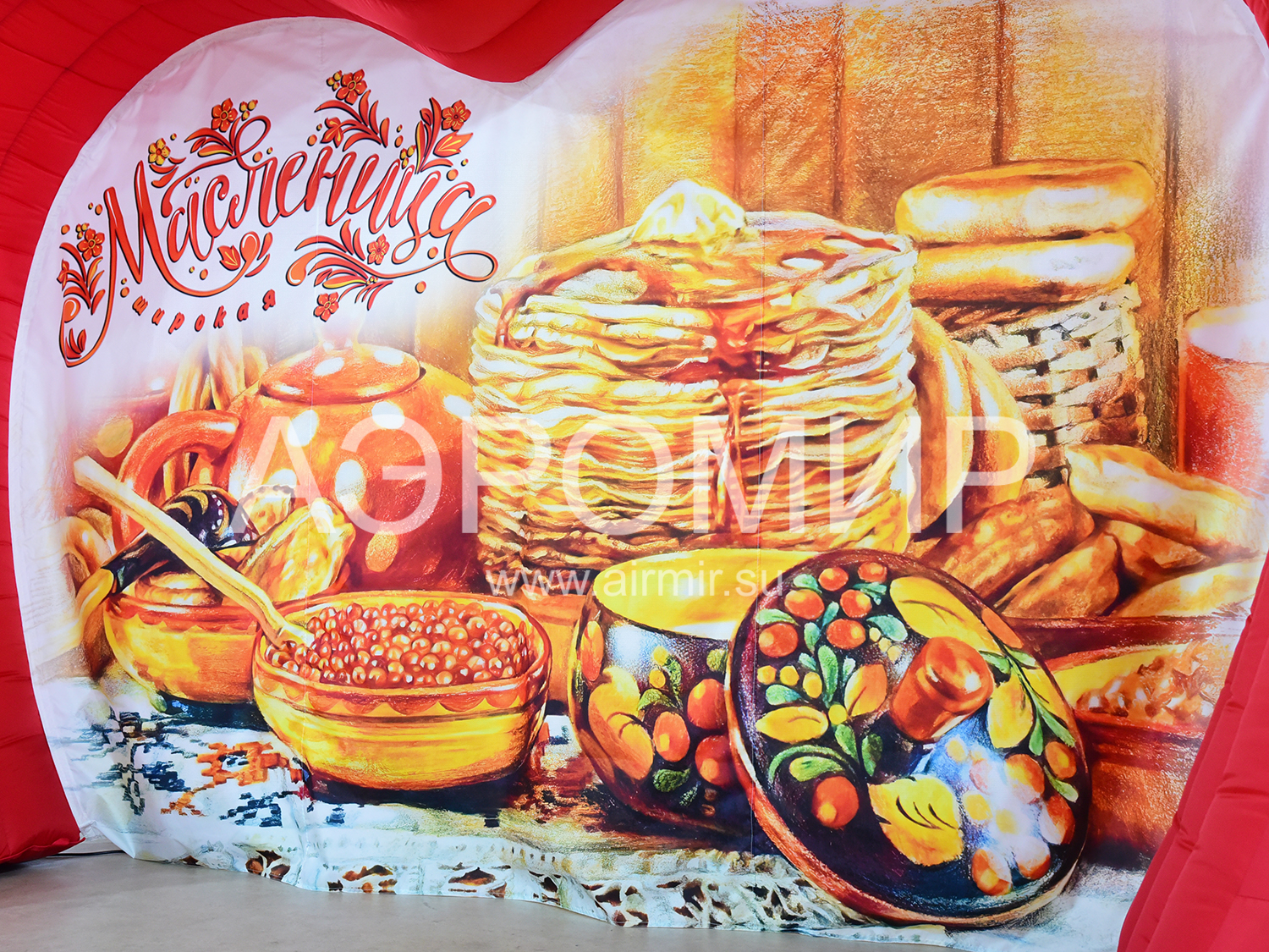 Красивая фотозона с масленичным баннером. Можно оформить входную группу, место фотографирования. Нанесем бренд или рекламный слоган на баннер, и арка станет не только масленичным декором, но и рекламной фигурой.