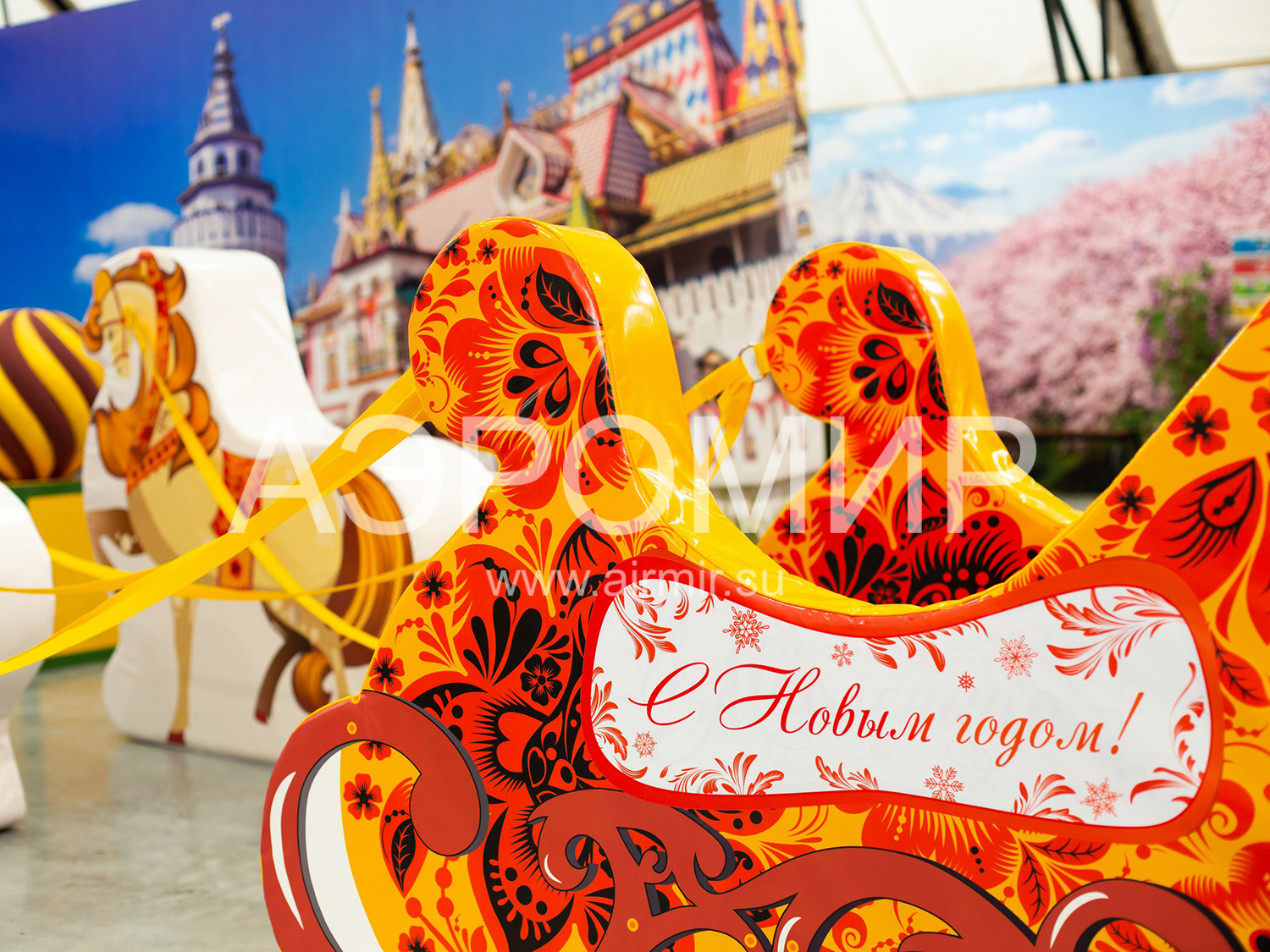 Красивая масленичная фотозона с санями и упряжкой лошадей. Невероятно яркая, привлекательная, для самых памятных фотографий. Можем нанести на изделие рекламную надпись или слоган, выполнить индивидуальное брендирование.