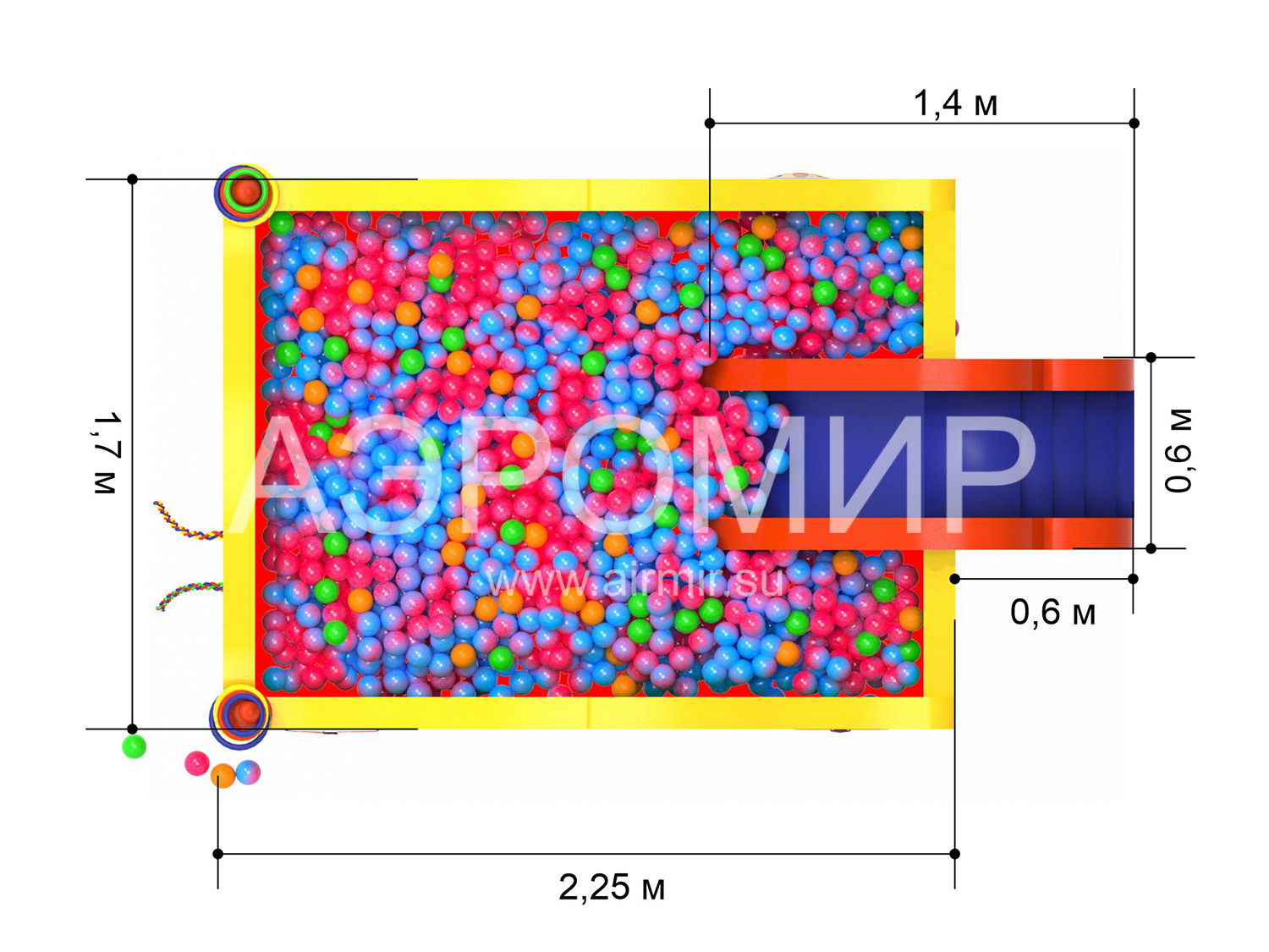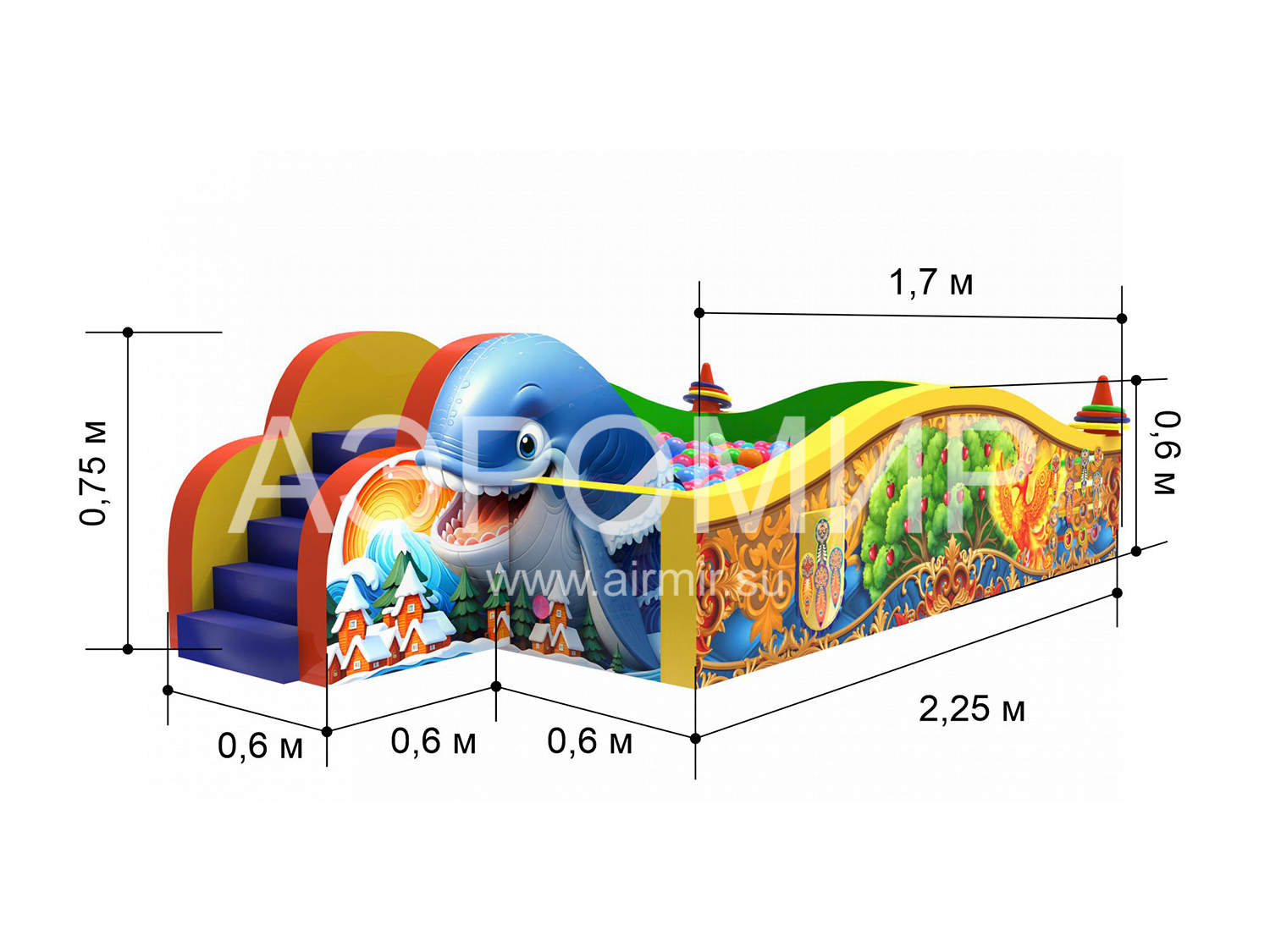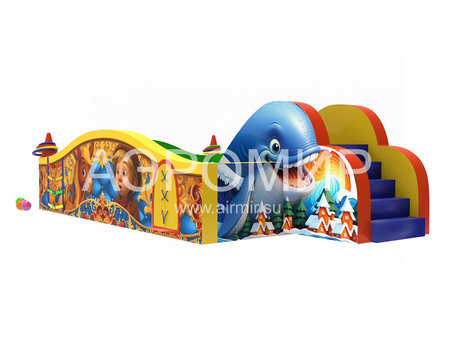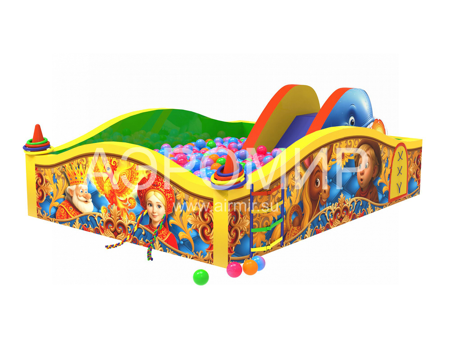 Humpbacked Horse - dry pool with a slide, filled with soft balls. The product is a designer of individual modules, easily assembled and disassembled, which significantly reduces the space for its storage and transportation. Characters from the Little Humpbacked Horse fairy tale are depicted on the sides. The module is equipped with sticky-stick figures: a pigtail, laces, flowers, etc. - for the development of fine motor skills. The height of the slide is 1 meter, which is safe for young children to ride. The product is made of hypoallergenic PVC. The pool can be used in kindergartens, holiday homes, hospitals. Any colors and decor to order. Included bag case for storage and transportation. Has a manufacturer's warranty for 1 year. The product will ship quickly in Russia and the CIS.